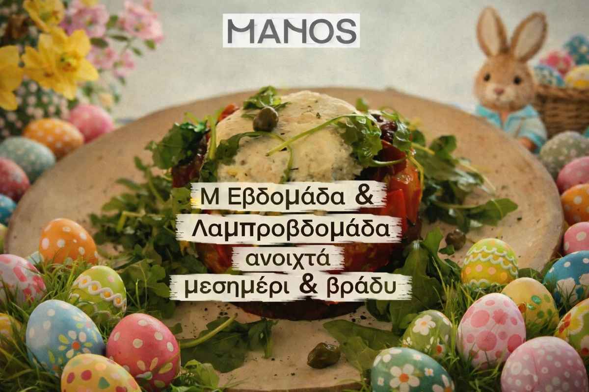 Για την καλύτερη εξυπηρέτηση του κοινού, το Manos θα παραμείνει ανοιχτό καθημερινά, καθ’ όλη τη διάρκεια της Μεγάλης Εβδομάδας αλλά και της Λαμπροβδομάδας.