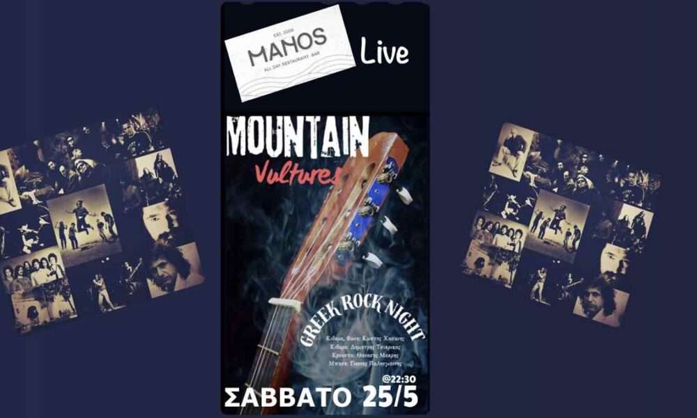 Live στο ΜΑΝΟΣ GREEK ROCK NIGHT Με τους ΜΟΥΝΤΑΙΝ vultures ΚΩΣΤΗΣ ΧΑΣΑΝΗΣ – κιθάρα, τραγούδι ΔΗΜΗΤΡΗΣ ΤΣΙΚΡΙΚΑΣ – κιθάρα ΘΑΝΑΣΗΣ ΜΑΚΡΗΣ – κρουστά ΓΙΑΝΝΗΣ ΠΑΛΗΟΓΙΆΝΝΗΣ –...
