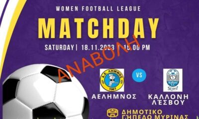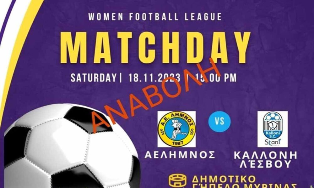 Λόγω των δυσμενών καιρικών συνθηκών αναβλήθηκε ο ποδοσφαιρικός αγώνας γυναικών ΑΕ Λήμνος – Καλλονή Λέσβου Η ενημέρωση της ΑΕΛ αναφέρει : “Δυστυχώς για 3η συνεχόμενη εβδομάδα...
