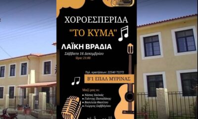 Οι μαθητές και οι μαθήτριες της Β1 του ΕΠΑΛ Μύρινας σας προσκαλούν στην Χοροεσπερίδα τους το Σάββατο 16 Δεκεμβρίου στις 21:00 Μια Λαϊκή Βραδιά στο...