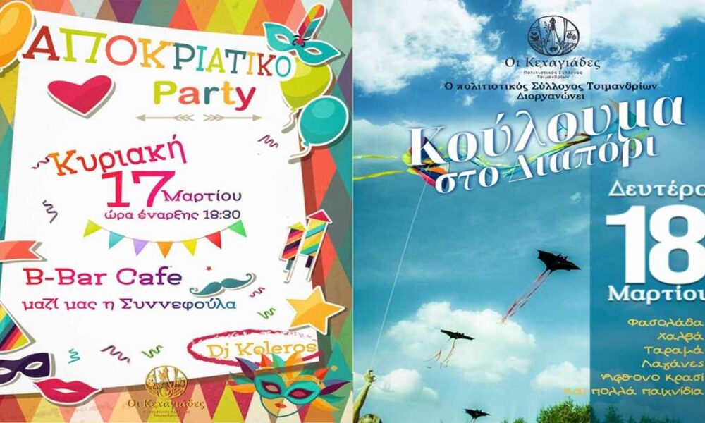 [fb_button] O Σύλλογος Τσιμανδρίων «Οι Κεχαγιάδες» με δυο εκδηλώσεις θα γλεντήσει την τελευταία βδομάδα των αποκριών! Την Κυριακή με ένα μοναδικό αποκριάτικο party στις 18:30 στο...