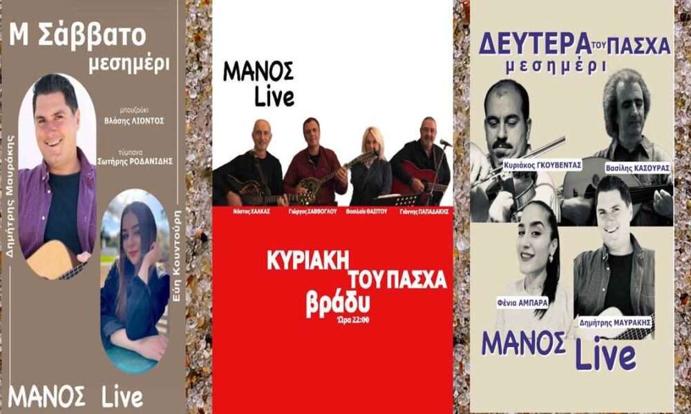 Μεγάλο Σάββατο μεσημέρι Live διασκέδαση στο ΜΑΝΟΣ Δημήτρης Μαυράκης – κιθάρα, τραγούδι Εύη Κουντούρη – τραγούδι Βλάσης Λιόντος – μπουζούκι Σωτήρης Ροδανίδης – τύμπανα Κρατήσεις 6932411134...