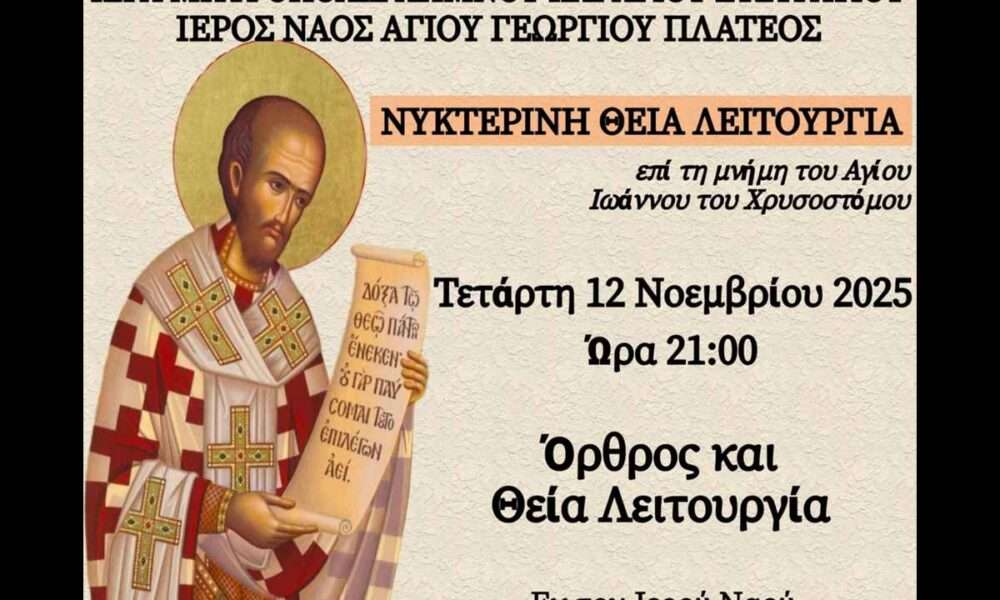 Ο Ιερός Ναός Αγίου Γεωργίου Πλατέος θα τελεστεί Νυκτερινή Θεία Λειτουργία για τη μνήμη του Αγίου Ιωάννου του Χρυσοστόμου. Η ακολουθία θα γίνει την Τετάρτη 12...