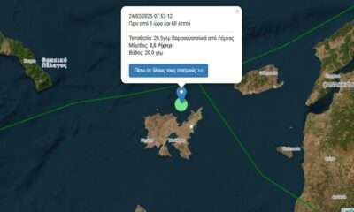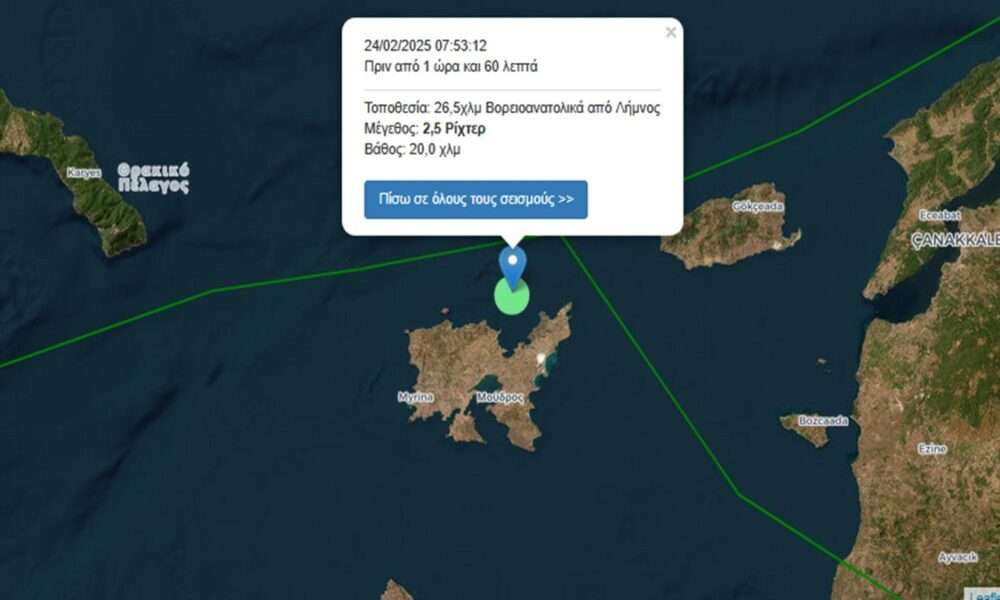 Σεισμική δόνηση 2,5 βαθμών της κλίμακας Ρίχτερ συνέβη στις 24/02/2025 07:53:12, 26,5χλμ Βορειοανατολικά από Λήμνος και σε εστιακό βάθος 20,0 χιλιομέτρων.