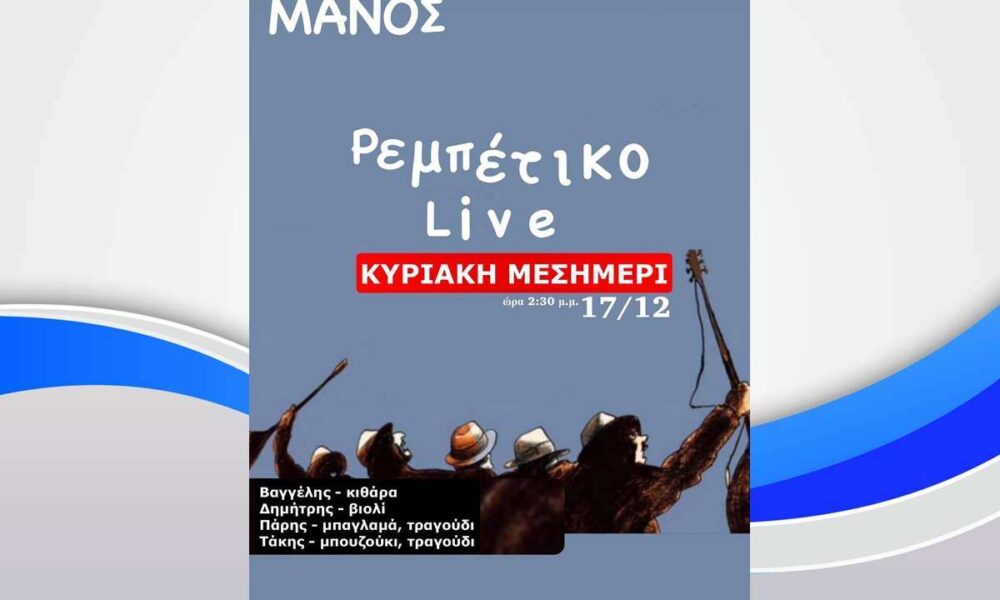 Κυριακή 4/2 μεσημέρι στο ΜΑΝΟΣ Ρεμπέτικο Live με τους: Βαγγέλης – κιθαρα, τραγούδι Δημήτρης – βιολί Τάκης – μπουζουκι, τραγούδι Πάρης – μπαγλαμά, τραγουδι Ώρα...
