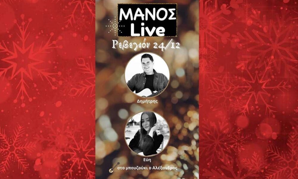 Ρεβεγιόν Χριστουγέννων 24/12 με Live μουσική στο ΜΑΝΟΣ με τους: Δημήτρης – κιθάρα, τραγούδι Εύη – τραγούδι Αλέξανδρος – μπουζούκι, τραγούδι Με εορταστικά πιάτα, κέφι &...