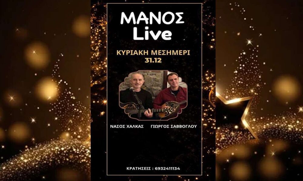 Κυριακή μεσημέρι, τελευταία μέρα του χρόνου Live στο ΜΑΝΟΣ Με τους: Νάσο Χαλκά-κιθάρα, τραγούδι Γιώργος Σαββόγλου-μπουζούκι, τραγούδι Ώρα έναρξης 14:30 Κρατήσεις: 6932411134
