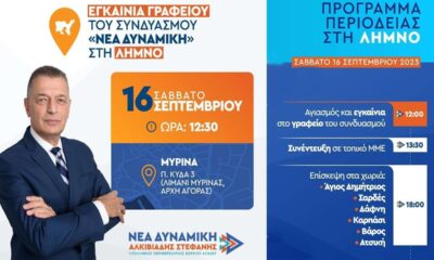 Σε κλίμα χαράς και ενθουσιασμού τελέστηκαν την Παρασκευή 15 Σεπτεμβρίου, τα εγκαίνια του πολιτικού γραφείου του συνδυασμού «ΝΕΑ ΔΥΝΑΜΙΚΗ» με επικεφαλής τον υποψήφιο Περιφερειάρχη Βορείου Αιγαίου,...