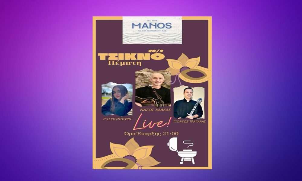 Τσικνοπέμπτη βράδυ live διασκέδαση στο ΜΑΝΟΣ με τους: Νάσος Χαλκάς – κιθάρα, τραγούδι Εύη Κουντούρη – τραγούδι Γιώργος Τραγάρας – μπουζούκι Κρατήσεις: 6932411134