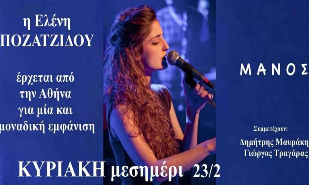 Η Ελένη Ποζατζίδου μια εξαιρετική ερμηνεύτρια της νέας γενιάς, έρχεται από την Αθήνα για μία και μοναδική εμφάνιση στο ΜΑΝΟΣ ΚΥΡΙΑΚΗ μεσημέρι 23/2 Συμμετέχουν: Δημήτρης Μαυράκης...