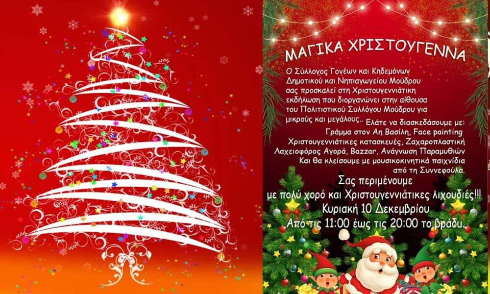 Ο Σύλλογος Γονέων και Κηδεμόνων του Δημοτικού και Νηπιαγωγείου Μούδρου σας προσκαλούν στη Χριστουγεννιάτικη Εκδήλωση που διοργανώνουν στην αίθουσα του Πολιτιστικού Συλλόγου Μούδρου για μικρούς και...